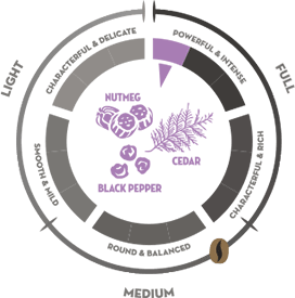 Un caffè intenso con vivaci accenti di cedro e noce moscata, esaltati da un tocco di pepe nero. Un caffè sottile con un profilo aromatico estremamente ricco. Perfetto per gli amanti di un cappuccino, espresso o ristretto davvero corposo.